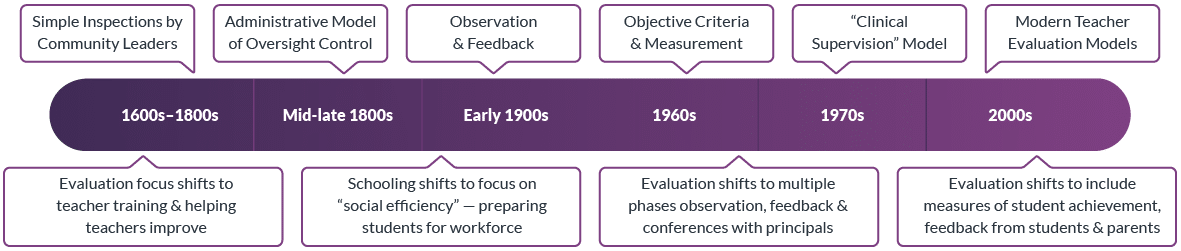 Teacher evaluation is as old as public schooling itself. Early accountability systems were comprised of no more than simple inspections of whether teachers were doing what was expected of them, without specific regard for student learning or achievement. When public schools shifted to an administrative as opposed to a community model of oversight and control in the mid- to late 19th century, leaders began to pay more attention to teacher training and helping teachers improve their practice.